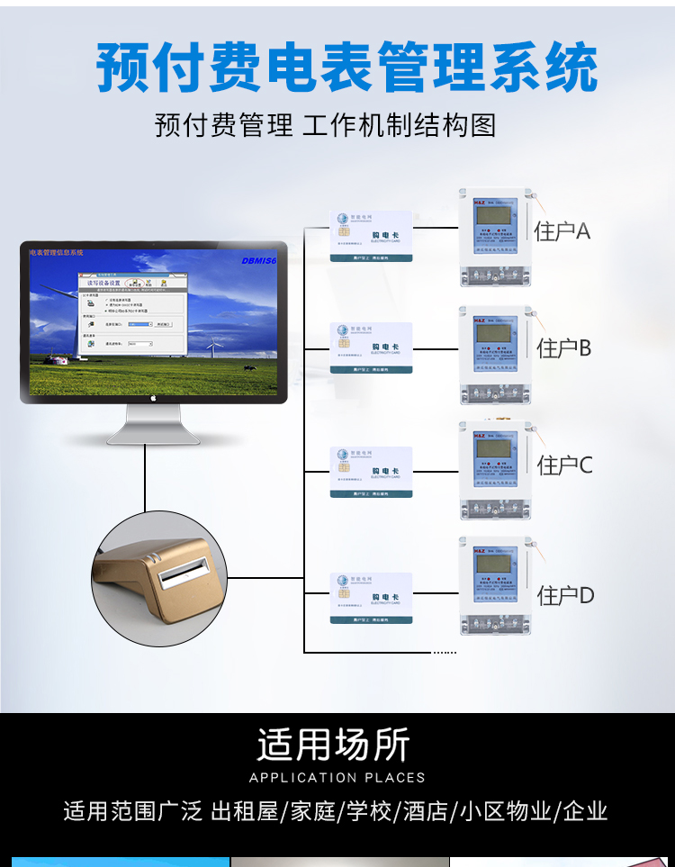 主要特點:應(yīng)用計算機管理,先購電后用電;在額定電流范圍內(nèi)能限制最大使用功率(由供電部門限定);一表一卡,專卡專用,失卡不失電,補卡再用;電卡能雙向傳遞數(shù)據(jù),能自動斷電告警用戶購電;電量為零時,自動拉閘斷電;并具有一定的防竊電軟件設(shè)計等。